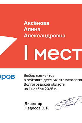 1 место на "Продокторов" в рейтинге детских стоматологов по Волгоградской области.