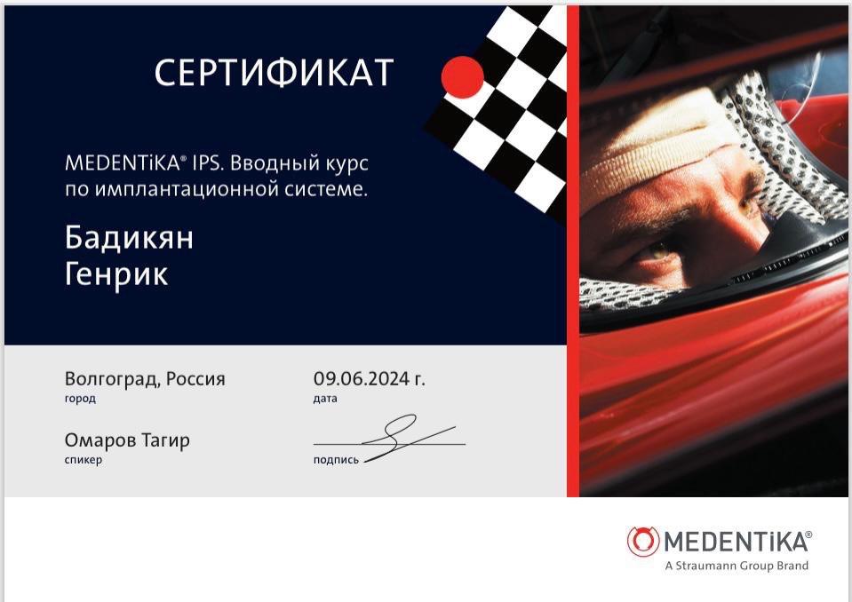 Сертификат о прохождении "Вводный курс по имплантационной системе". Омаров Т.
