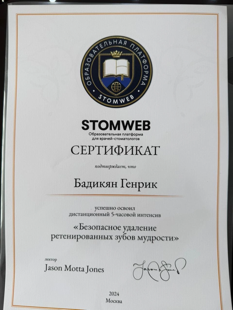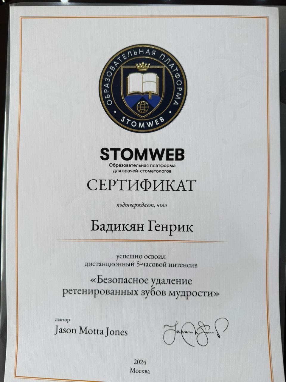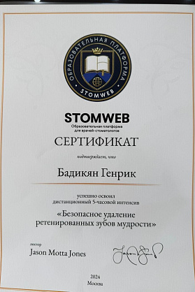 Сертификат о прохождении 5-часового интенсива "Безопасное удаление ретенированных зубов мудрости". Jason Motta Jones.