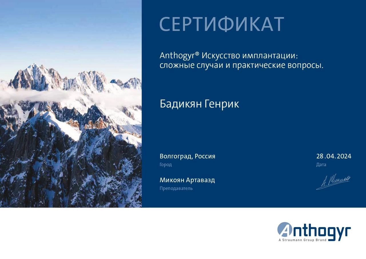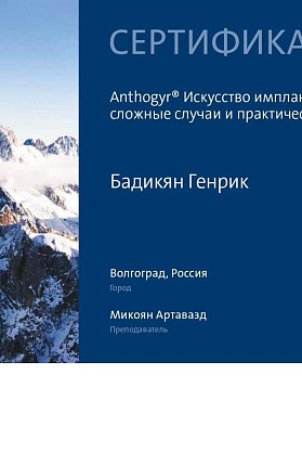 Сертификат о прохождении "Anthogyr. Искусство имплантации: сложные случаи и практические вопросы".