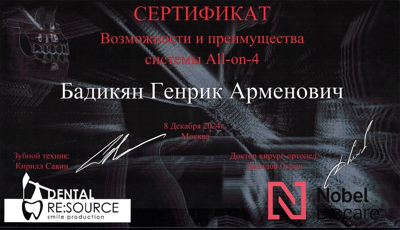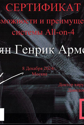 Сертификат о прохождении "Возможности и преимущества системы All-on-4".