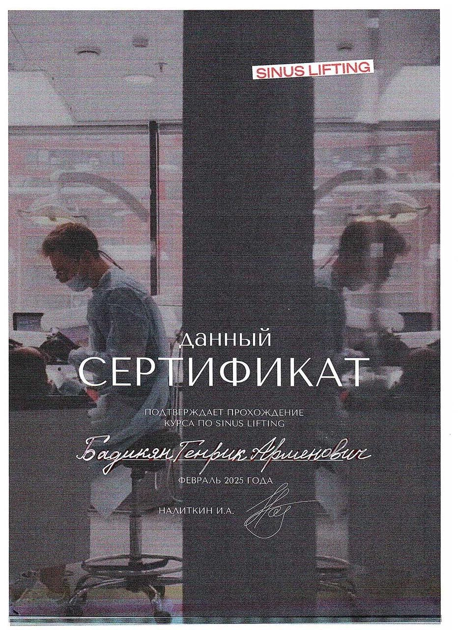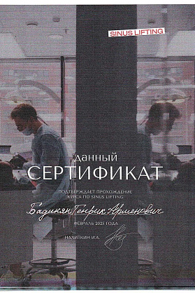 Сертификат о прохождении курса "SINUS LIFTING".