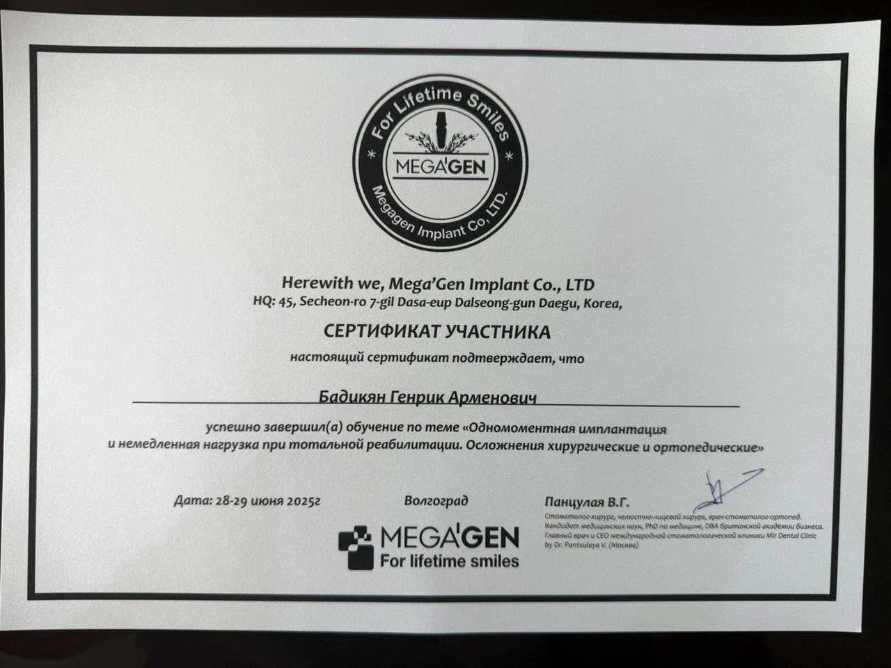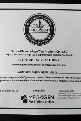 Сертификат об обучении на тему: "Одномоментная имплантация и немедленная при тотальной реабилитации. Осложнения хирургические и ортопедические".
