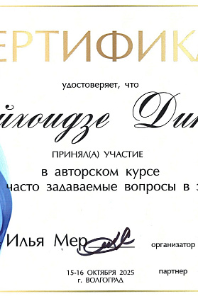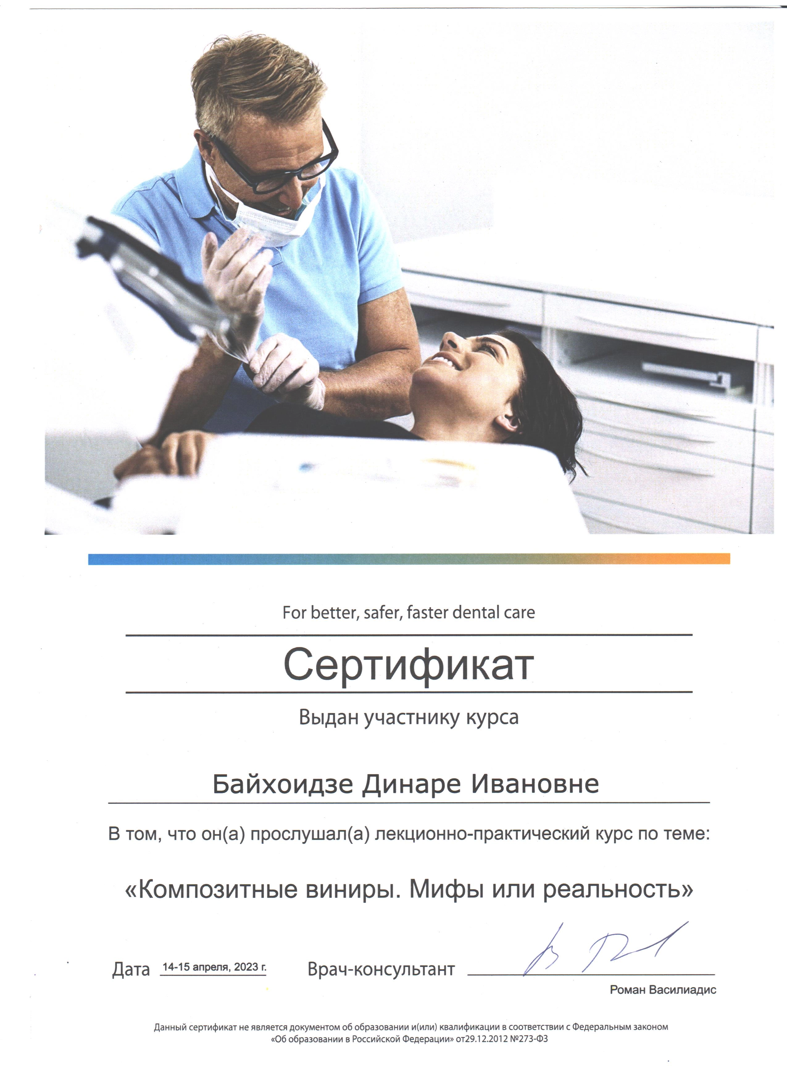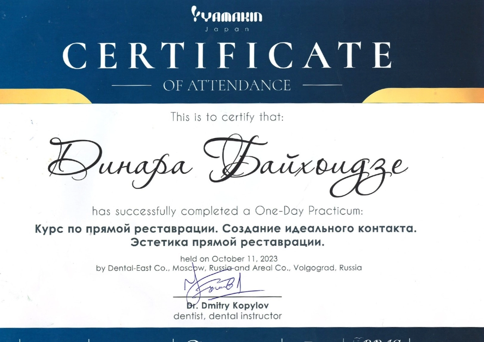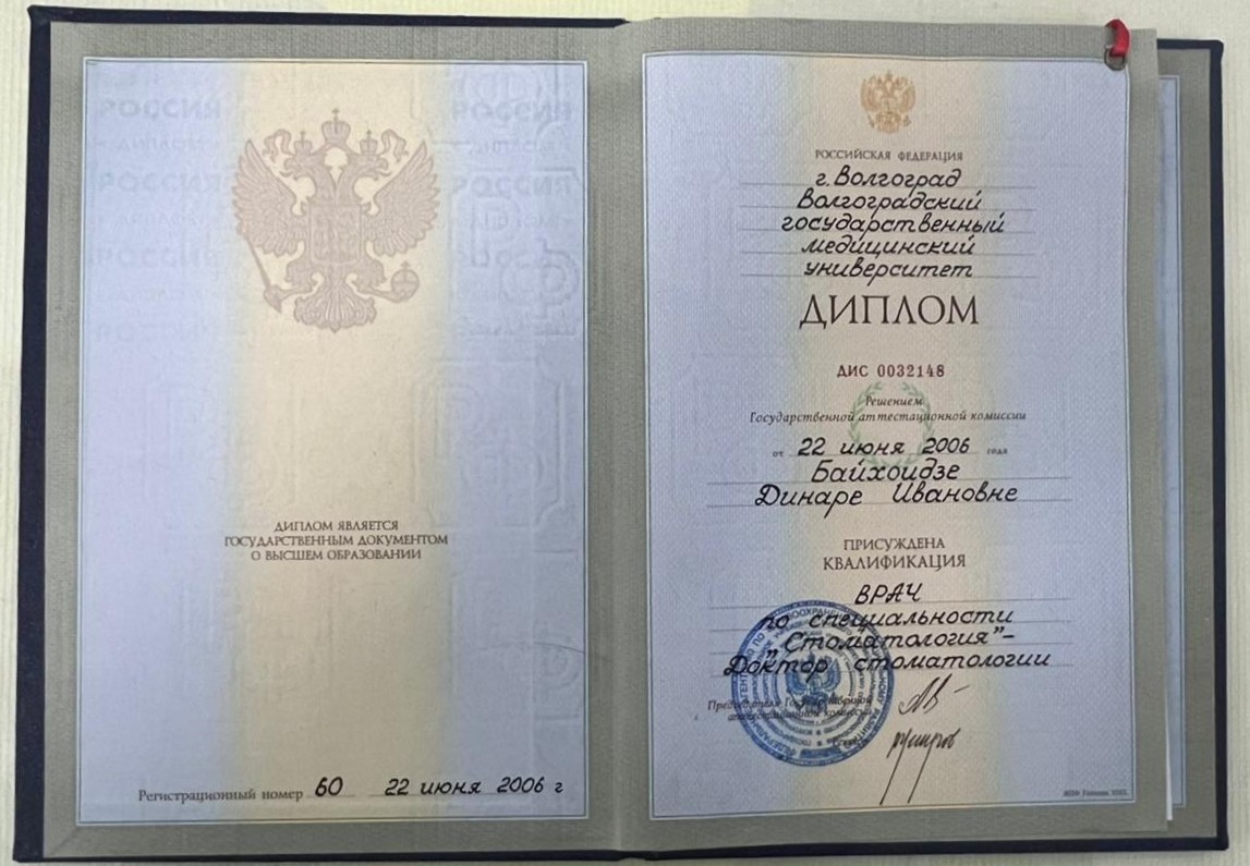 Прошла аккредитацию по специальности "стоматология терапевтическая". Действительна до 2025 г.