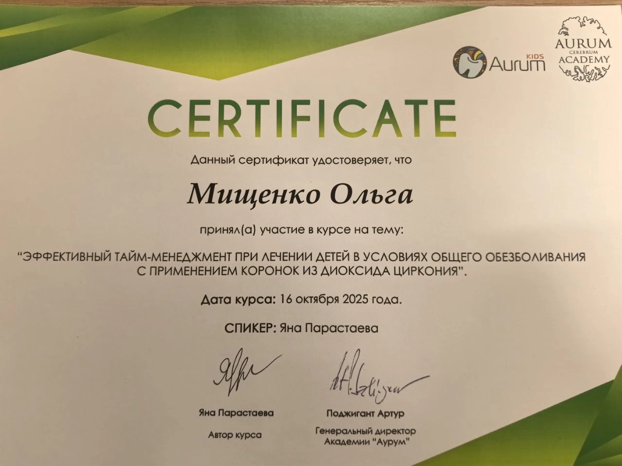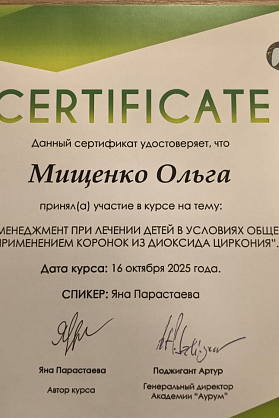 Прошла курс на тему: "Эффективный тайм-менеджмент при лечении детей в условиях общего обезболивания с применением коронок из диоксида циркония".
