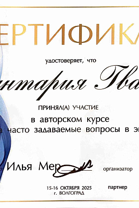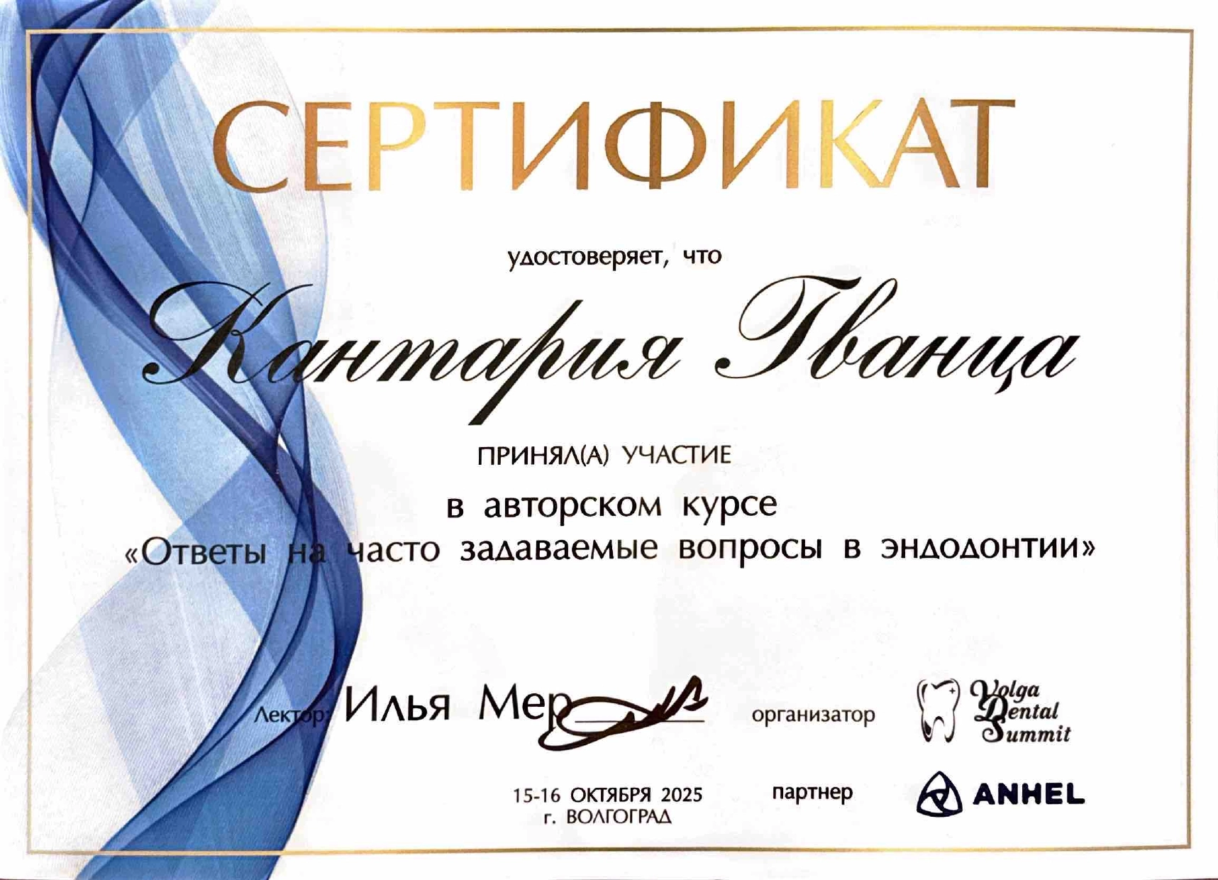Сертификат об участии в авторском курсе "Ответы на часто задаваемые вопросы в эндодонтии".